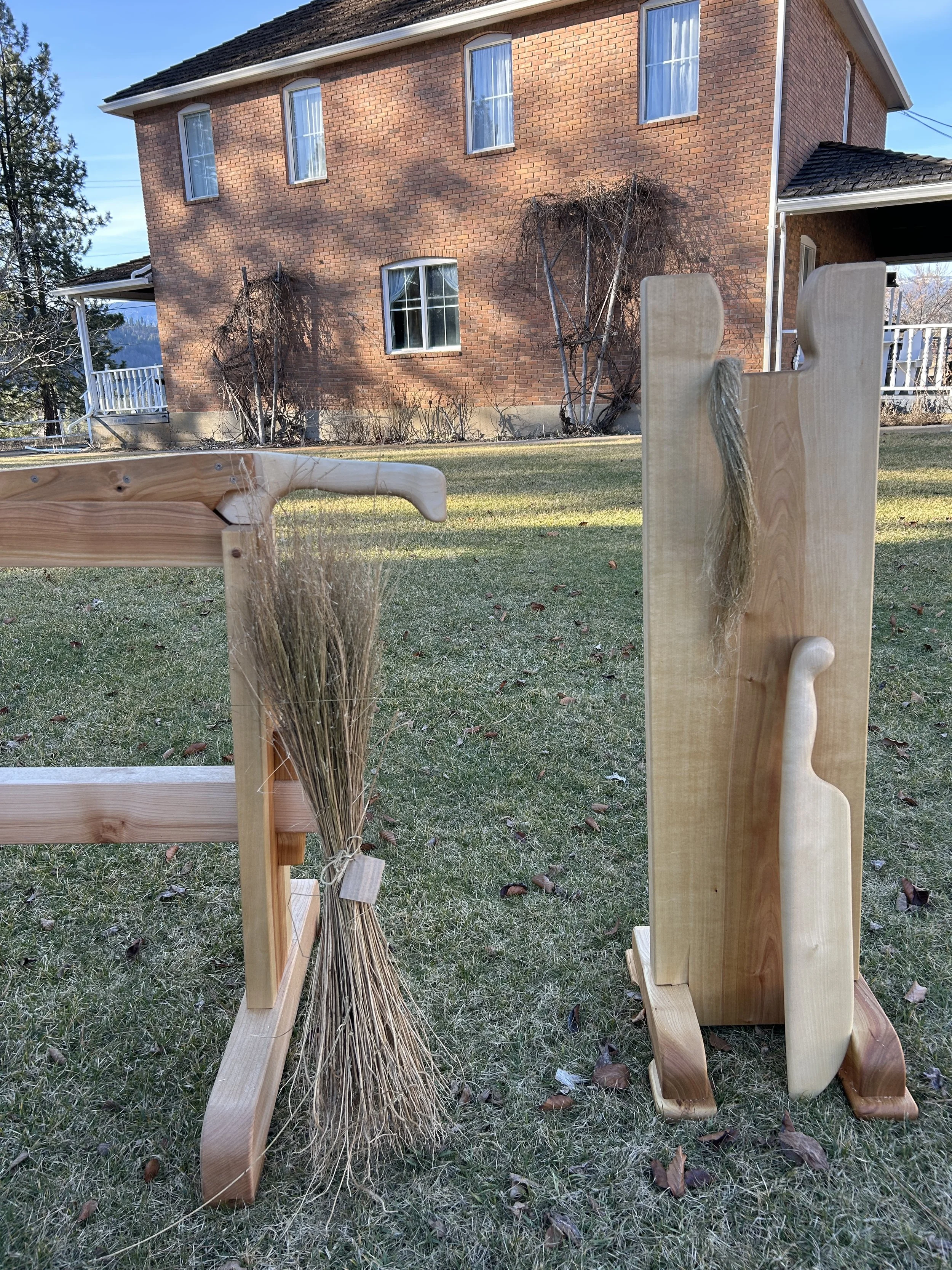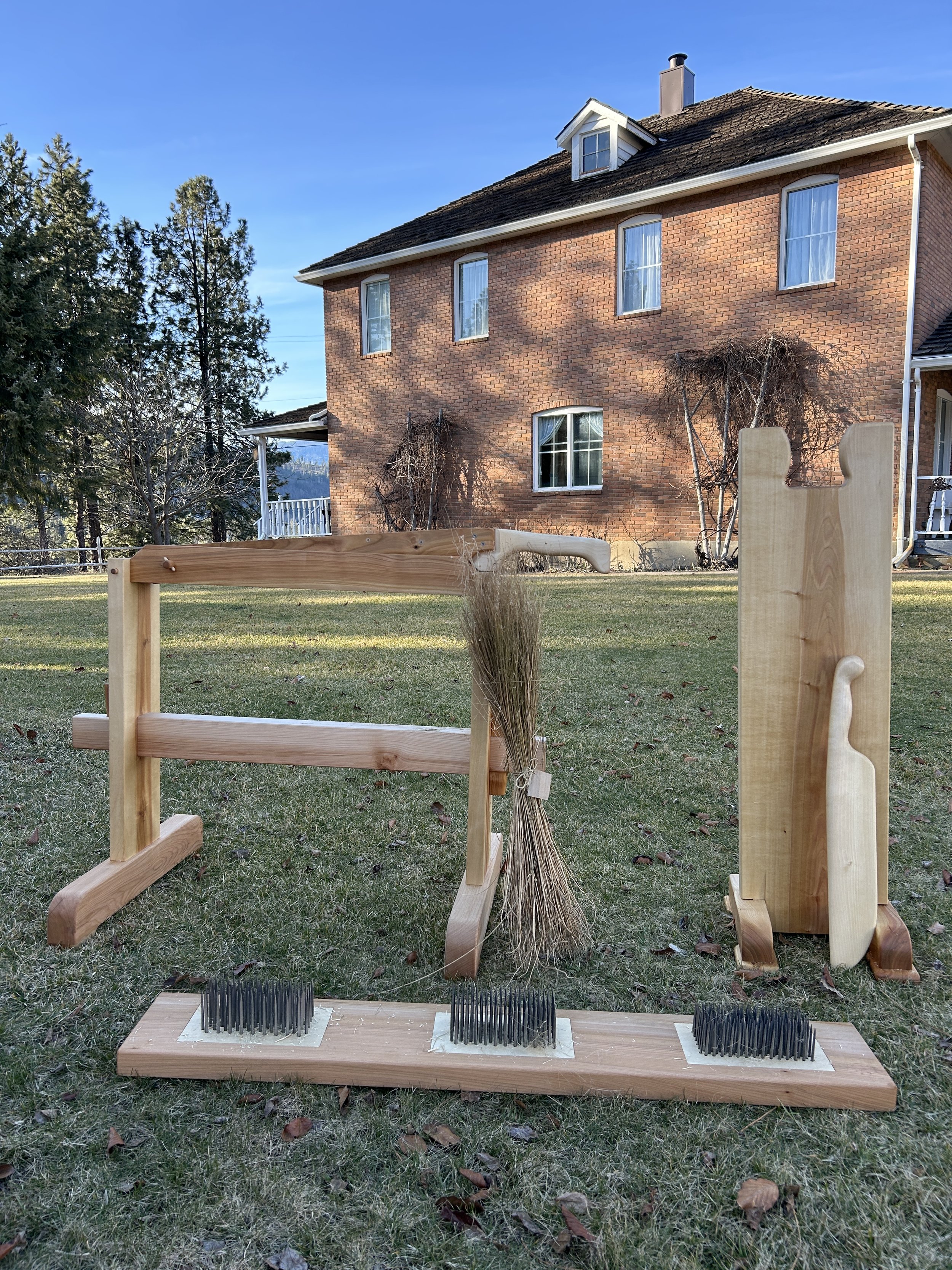 With recent grant support from Kootenay Savings Community Foundation and CBT, we built 4 full sets of flax processing tools - brakes, ripplers, scutching boards, and hackles - that allow community members to learn and practice turning flax into linen during workshops. They are also through our Fibre Tool Library. Thanks to Scott Fettes, Meadow Creek resident, for building these tools for us! They are truly pieces of art in of themselves.