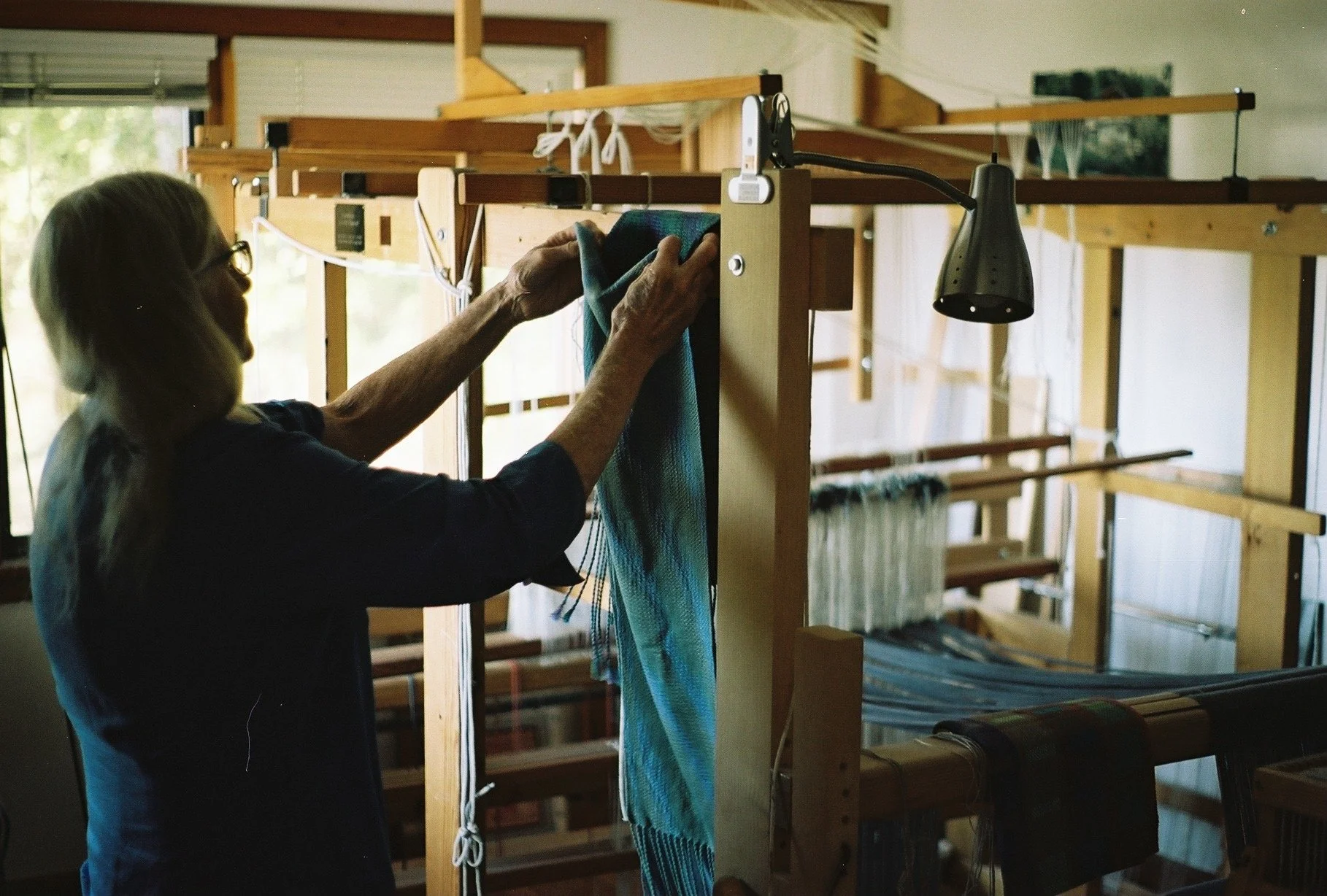 1975 was basically my first floor-loom weaving experience. I heard about a family living in Cherryville, British Columbia—their names were Wanya and Jack Tuan. Jack was a loom builder, and they built Swedish counterbalance looms. Wanya was a weaving teacher, and you could go and spend a week there, camping on the property and weaving in their barn workshop during the day.