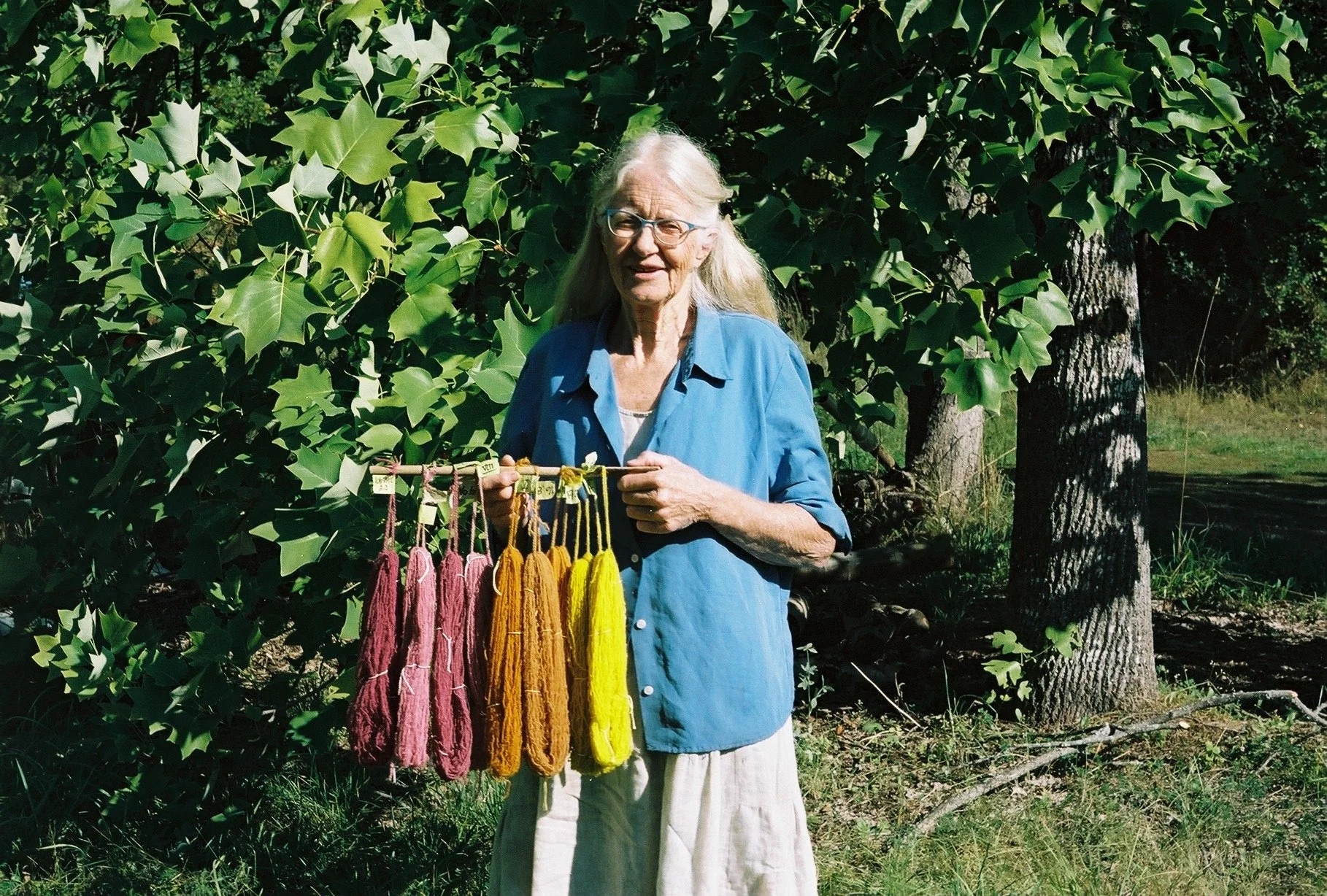 Coby Vandergaast holding handspun and naturally dyed wool skeins at her home in Queens Bay, BC | West Kootenay Bioregion