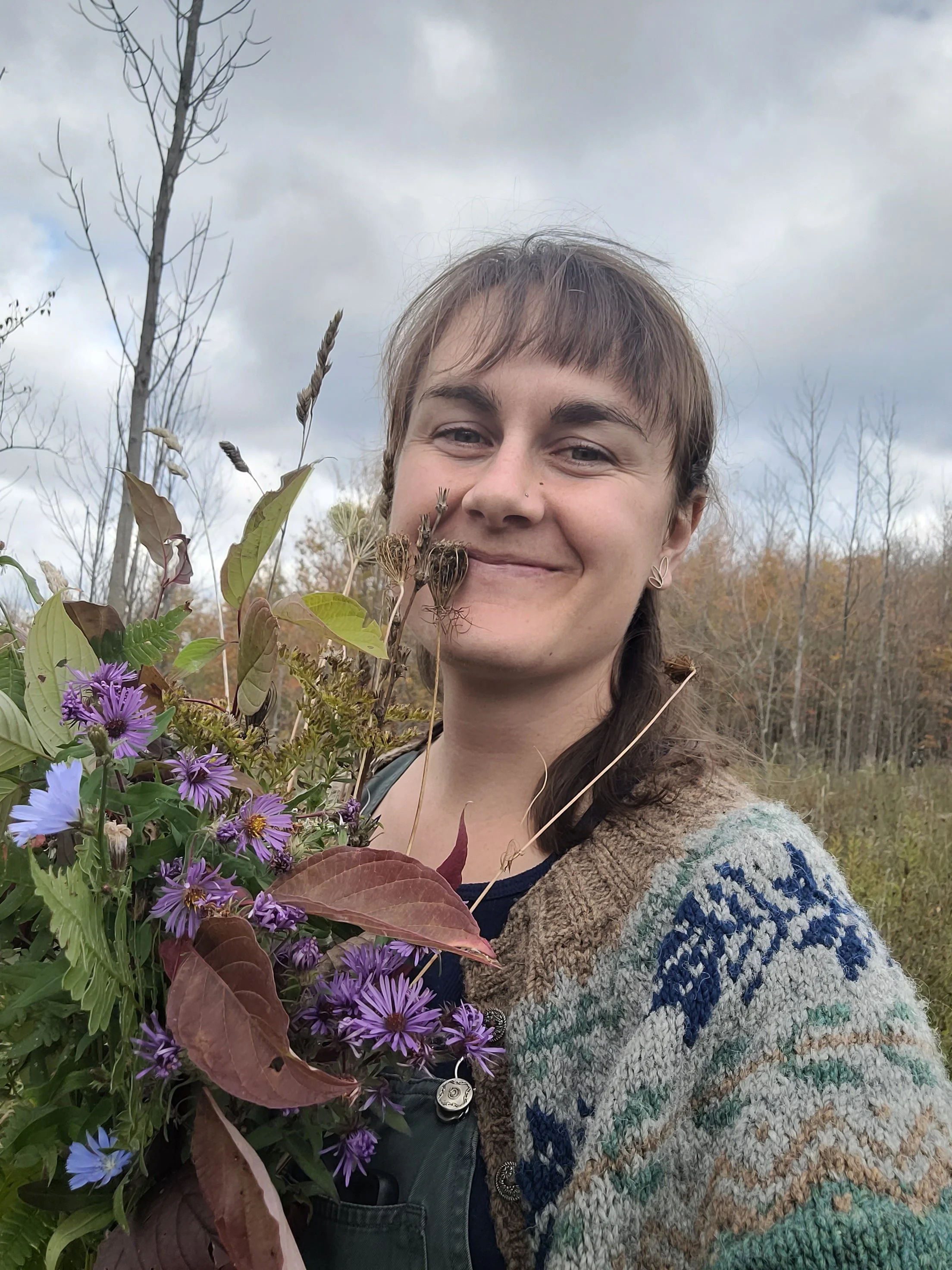 Danielle Soucie is a fibre artist and the founder of Earthborn Textiles, where she raises alpacas, grows dye plants, and creates handspun, naturally dyed, and handwoven garments from their fleece. Her personal practice is rooted in material literacy and transformation, working closely with fibre from raw form through processing, spinning, dyeing, and weaving. Through these processes she explores the full lifecycle of materials and the relationships between land, labour, and craft.